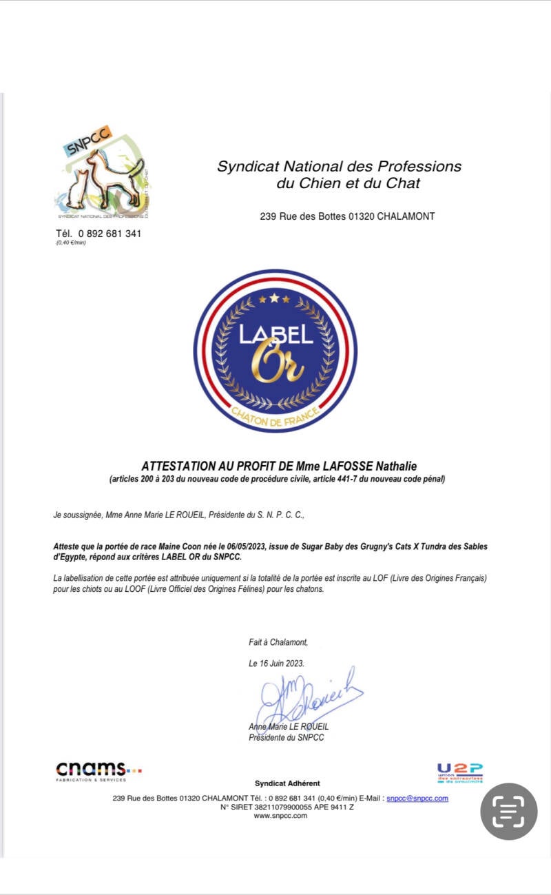 NOS PORTÉES SONT LABELLISÉES PAR LE SNPCC (SYNDICAT NATIONAL DES PROFESSIONS DU CHIEN ET DU CHAT).